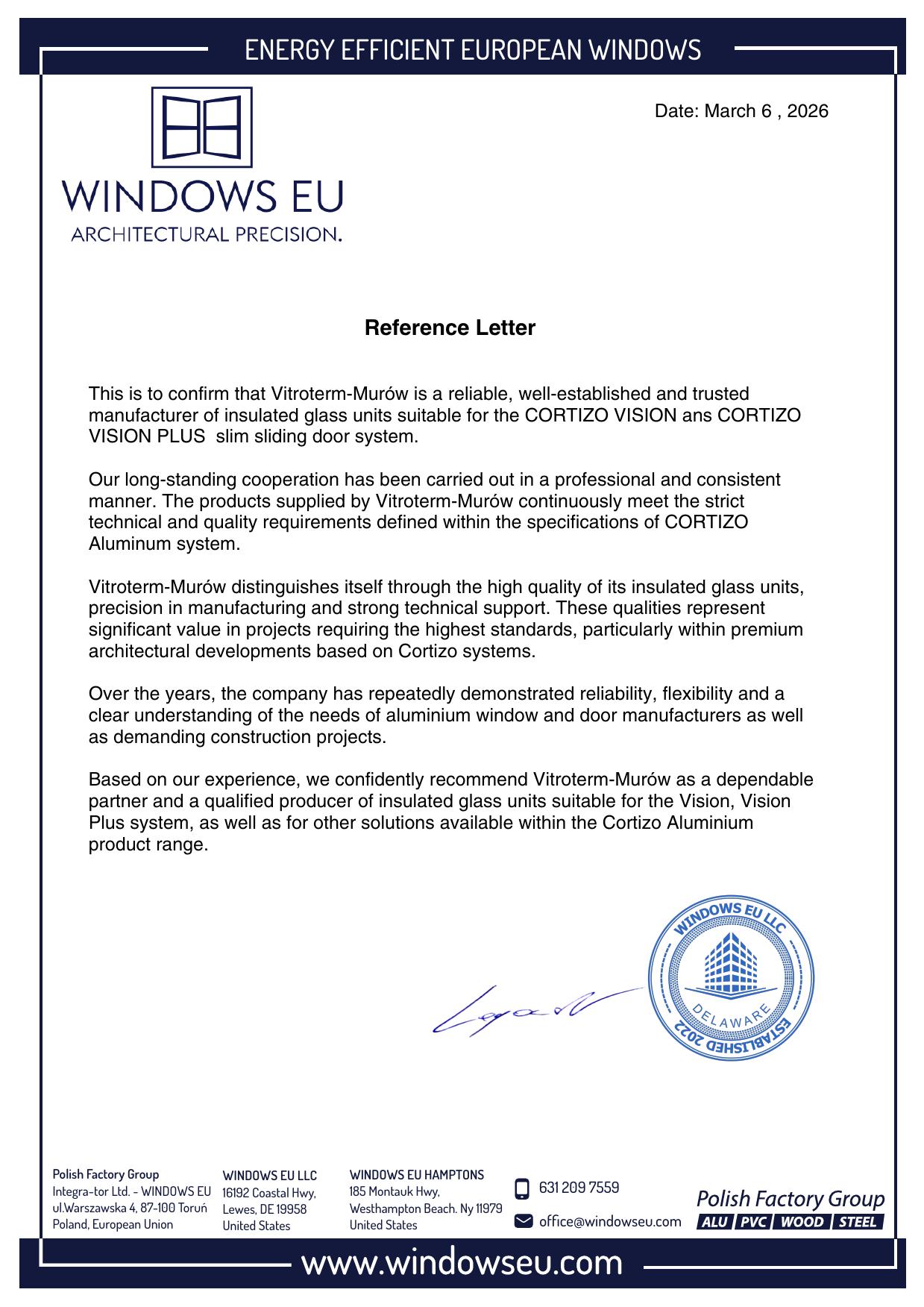 Realizacja projektów w systemie COR VISION wymaga wysokiej precyzji wykonania oraz znajomości specyfiki tego rozwiązania. Vitroterm-Murów posiada certyfikat potwierdzający kompetencje w zakresie produkcji szyb zespolonych do tego systemu, otrzymany od firmy, z którą realizowaliśmy zamówienie na przeszklenia COR VISION. Dokument ten stanowi potwierdzenie jakości wykonania, zgodności z wymaganiami technicznymi oraz doświadczenia naszego zespołu w pracy z wielkogabarytowymi przeszkleniami stosowanymi w nowoczesnej architekturze.
